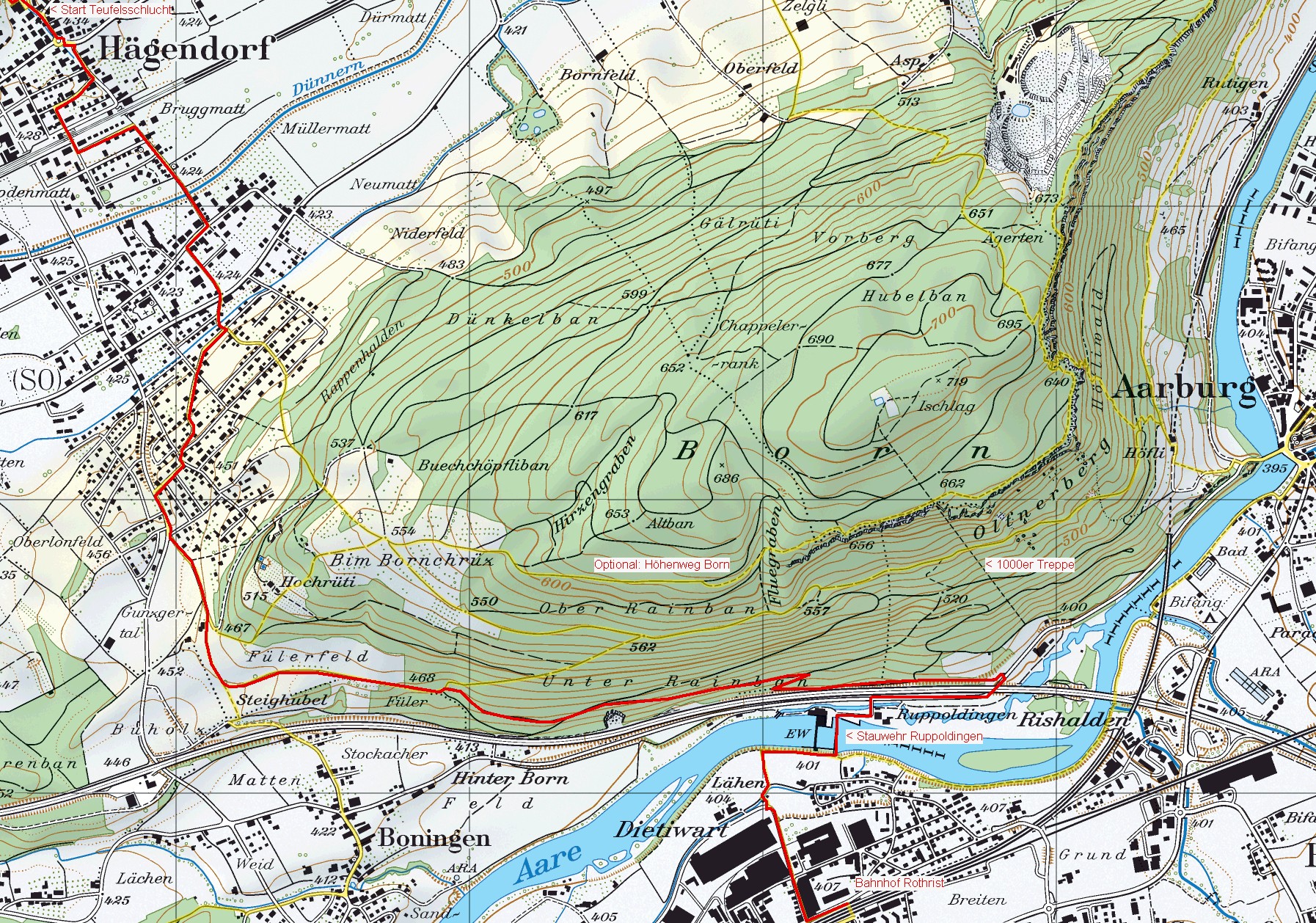 Als Alternative schlagen wir Ihnen eine Fahrt mit dem öffentlichen Bus von Glashütten zum Bahnhof Rothrist vor (15 Minuten Fahrtzeit). Von dort aus ist die Teufelsschlucht nach einer Wanderung von rund 5 Kilometern erreicht. Falls gewünscht, können Sie auch bis nach Härkingen mit den öffentlichen Verkehrsmitteln reisen.